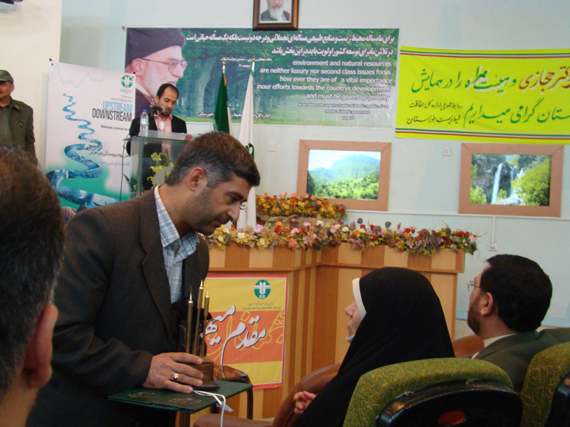 اهداء تندیس فلامینگو به رضا خلیلی ورزنه به مناسبت انتخاب به عنوان قهرمان تالابهای ایران در سال 1387 توسط خانم دکتر جوادی ریاست وقت سازمان محیط زیست کشور صورت گرفت.